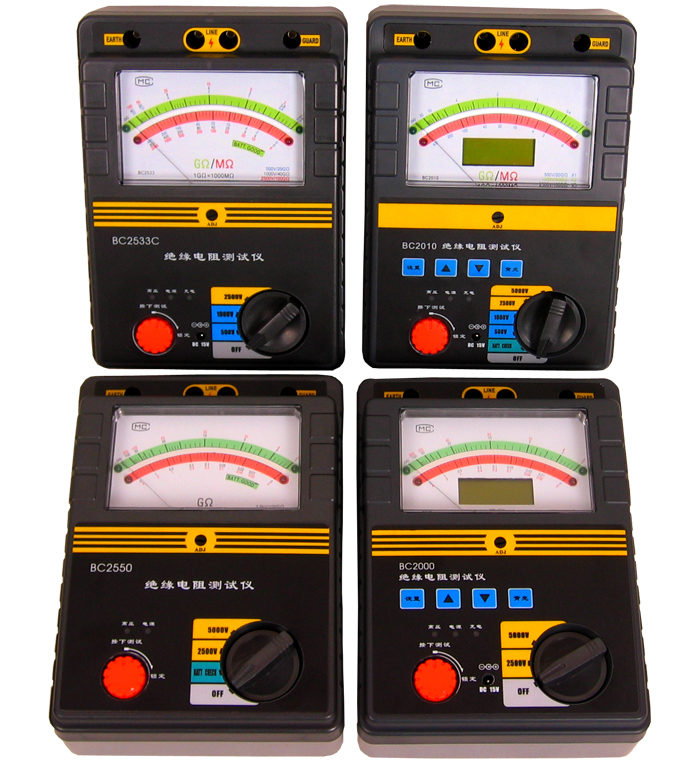 雙顯(機械指針與數(shù)字顯示); 交直流兩用帶充電電池;吸收比、極化指數(shù)測試;短路電流3.3mA; 參數(shù)存儲。