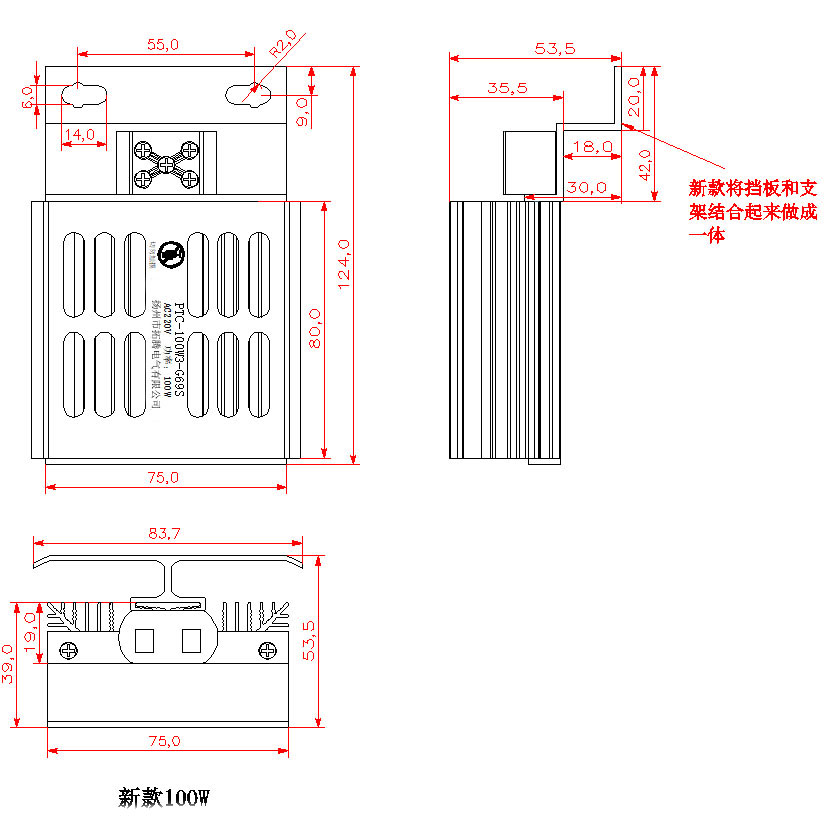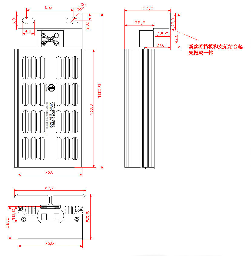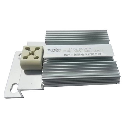 【PTC加熱器說明】 采用PTC熱敏電阻為發(fā)熱體,恒溫發(fā)熱、無明火、熱轉換率高、受電源電壓影響極小、自然壽命長等傳統(tǒng)發(fā)熱原件無法比擬的優(yōu)勢,拓騰出品,必為精品,值得信賴. 【PTC加熱器特點】 PTC熱敏電阻以恒溫發(fā)熱,無明火,熱轉換率高,受電源電壓影響極小,自然壽命長等傳統(tǒng)發(fā)熱原件無法比擬的優(yōu)勢,在電熱器具中得以廣泛應用,我公司現(xiàn)推出全新款P T C 柜體加熱器,產品質量與國外同類產品相比好不遜色,如魯薩曼,阿爾法,威圖,斯泰格等等,我司生產的PTC加熱器有四種安裝方式,該型號為獨立式帶安裝支架,每個產品出廠均經過嚴格測試。產品螺絲均采用304不銹鋼材質,防鹽霧。 【PTC加熱器型號】 公司PTC加熱器有三種安裝方式:加熱器支架一體式、平板單頭安裝、平板雙頭安裝。該產品是加熱器支架一體式產品。