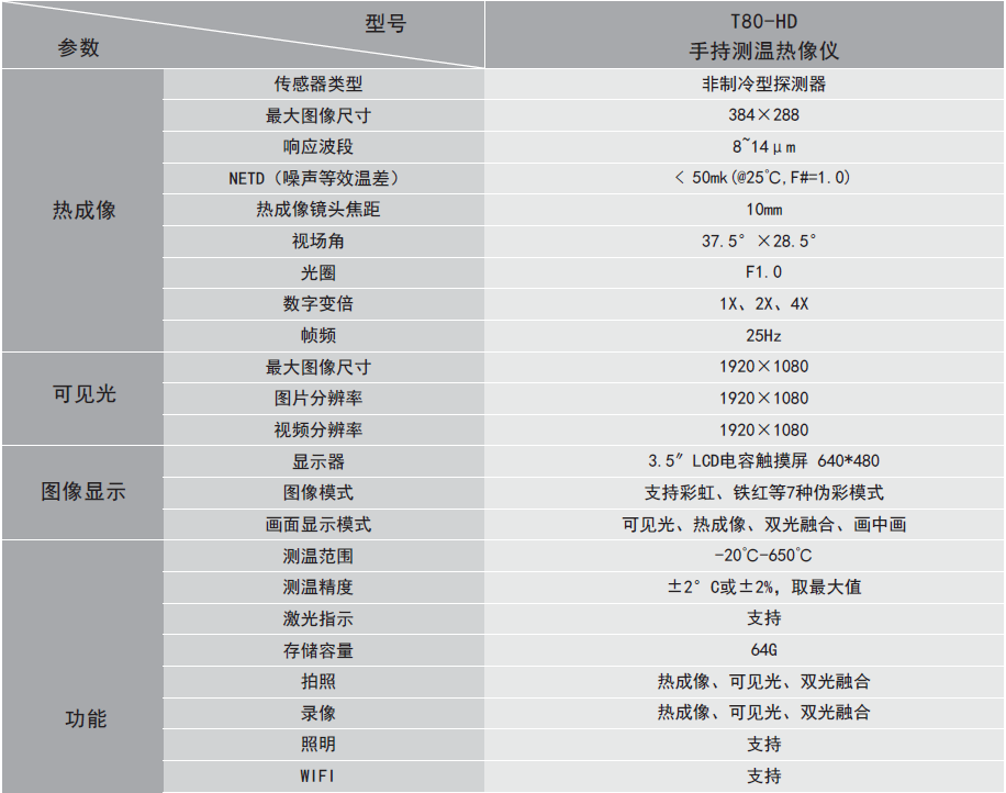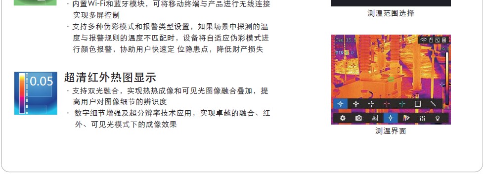 功能特點(diǎn) ● 高清晰顯示的熱像儀采用先進(jìn)的雙光融合技術(shù),實(shí)現(xiàn)熱成像和可見(jiàn)光圖像融合疊加,紅外圖片如數(shù)碼相片一樣清晰,幫助您發(fā)現(xiàn)隱藏問(wèn)題,使您能更迅速的做出關(guān)鍵決策 ● 享受移動(dòng)互聯(lián)網(wǎng)帶來(lái)的便利 支持通過(guò)wifi及藍(lán)牙和智能設(shè)備連接,它可隨時(shí)聯(lián)網(wǎng)自動(dòng)升級(jí)熱像軟件功能,還可以隨時(shí)用網(wǎng)絡(luò)分享現(xiàn)場(chǎng)的熱像圖片 ● 全新智能操控體驗(yàn) 從T80-HD專業(yè)熱像儀告別了繁瑣的按鍵,觸控操作體驗(yàn),熟悉的手機(jī)APP相機(jī)操作簡(jiǎn)單易用 ● 良好的攜帶性 外形簡(jiǎn)約,小巧便攜,符合人體工學(xué)設(shè)計(jì),非常適合維護(hù)人員長(zhǎng)時(shí)間使用