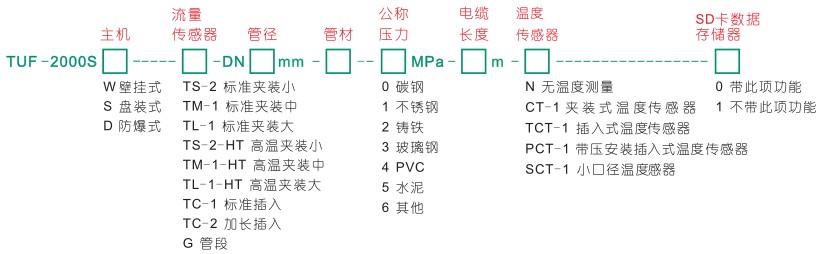 舉例說明:TUF-2000SW-TM-1-DM300-0-1.6MPa-10m-PCT-1-0 解釋:固定分體式超聲波流量計(jì)選配壁掛式主機(jī),中型夾裝式傳感器,管徑DN300,碳鋼材質(zhì),公稱壓力1.6MPa,主機(jī)與傳感器之間電纜長度10m,配接帶壓安裝插入式傳感器,帶SD卡數(shù)據(jù)存儲(chǔ)功能。