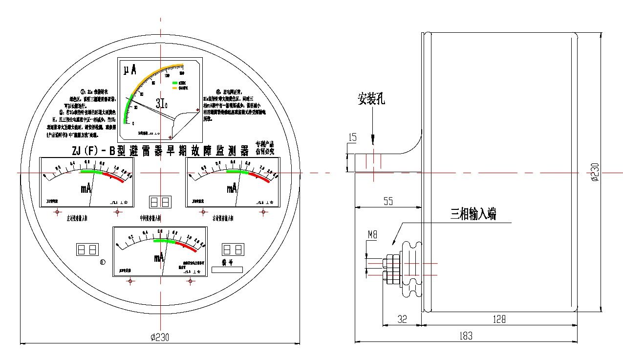 ZJ(Z)型監(jiān)測器及ZJ(F)型監(jiān)測器測量元件,是由三塊mA表,三個2位數(shù)的計數(shù)器及3Io微安表組成,共同組裝在一個Φ230圓柱形不銹鋼筒內(nèi),后座為壓鑄鋁,在后座有安裝孔及輸入接線端,面版為玻璃。外形及尺寸見圖3