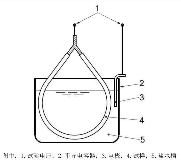 試樣:準(zhǔn)備最小350 mm長(zhǎng)試樣,從每端剝?nèi)?5 mm絕緣,把導(dǎo)體兩端扭在一起形成環(huán)。 裝置:如圖1所示,在非導(dǎo)電容器中裝上鹽水(質(zhì)量比為3%的NaCl水溶液) ,試樣端頭露在液面上面。使用頻率為50 Hz或60 Hz的交流電壓源。 60V電線 如圖1所示把試樣浸漬在水浴中,4 h后在導(dǎo)體和水浴之間施加1 kV (均方根)測(cè)試電壓30 min.然后以500 V/s速率增加電壓到以下電壓值: