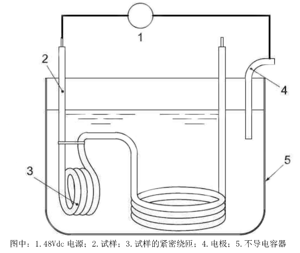 耐熱水GB/T25085-2010 11.5 試樣:制備2段長(zhǎng)(2.5士0.1)m的試樣,在各端剝?nèi)?5mm的絕緣。 設(shè)備:試驗(yàn)設(shè)備包括:不導(dǎo)電的容器(內(nèi)設(shè)一只未用過的鹽水槽,在每次試驗(yàn)中,鹽水槽內(nèi)盛有NaCl含量為10g/l 的85士5°C的水); 48V直流電源;銅電極及6.4. 3節(jié)規(guī)定的電阻測(cè)量設(shè)施。 程序:試樣在芯軸上緊密纏繞至少三圈,并如圖8所示可靠捆扎,移去芯軸后,將試樣浸潰水浴中,末端伸出水浴之上250mm。為避免材料之間相互作用,在同一個(gè)水浴中不得用不同絕緣材料的試樣。試樣一端和電源正極相連。七天后,取消供電,測(cè)量絕緣體積電阻率。但對(duì)6. 4規(guī)定程序作如下改動(dòng):