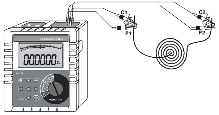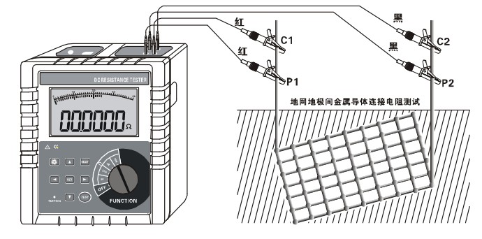 ✧ 測試端:C1電流正/P1電壓正;C2電流負/P2電壓負 ✧ 具有測試報警設置:報警臨界值設定范圍:1Ω-30Ω ✧ 標準導線長度設置范圍:1m-30m ;精密四線法測量 ●四線法測量電線長度