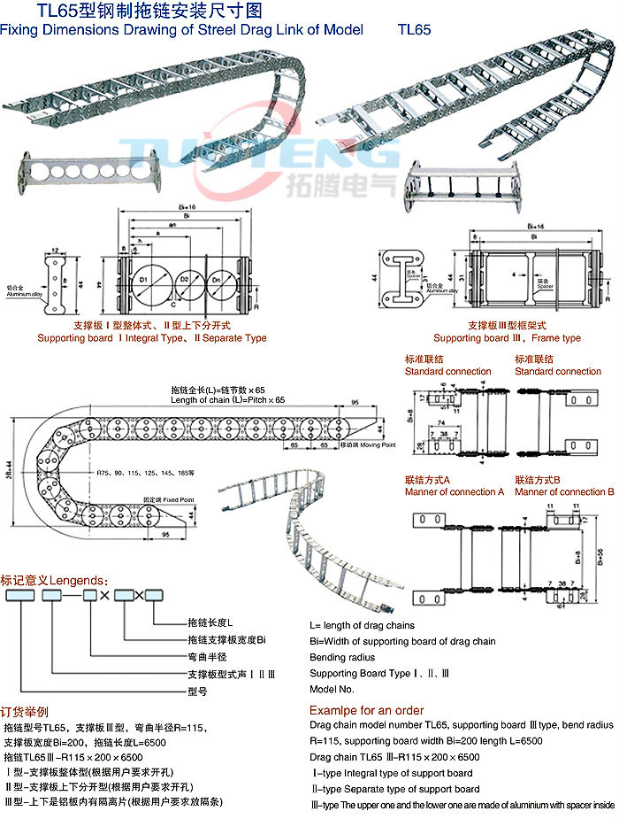 TL系列拖鏈主體是由鏈板(鋼板鍍鉻)支撐板(擠拉鋁合金)軸銷(合金鋼)等部件組成,使電纜或橡膠管與拖鏈之間不產(chǎn)生相對(duì)運(yùn)動(dòng),不產(chǎn)生扭曲變形,鏈板經(jīng)鍍鉻處理外形效果更新穎,結(jié)構(gòu)合理,靈巧強(qiáng)度,鋼性好不變形,安裝方便,使用可靠,易拆裝,尤其是本產(chǎn)品采用了強(qiáng)度耐磨材料,合金銅為軸銷,提了產(chǎn)品耐磨強(qiáng)度,彎曲更靈活,阻力更小,降低了噪音,從而可保證長時(shí)間使用不變形,不下垂。