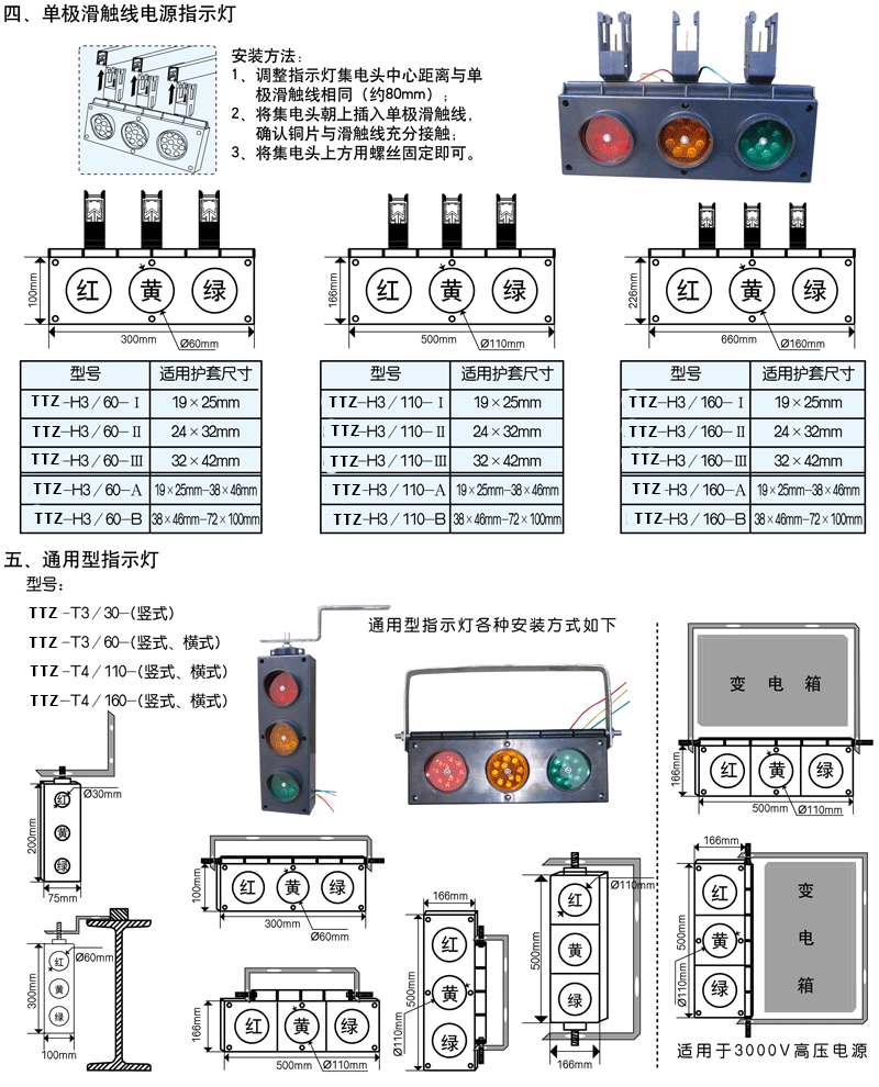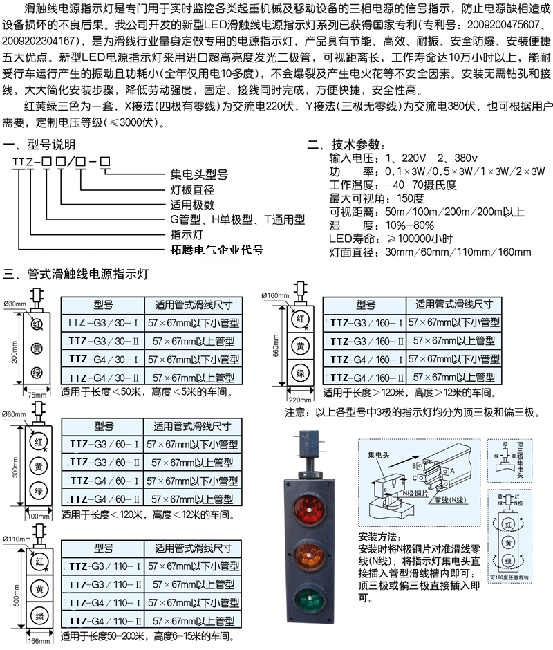 滑觸線指示燈 紅黃綠三為一套,X接法(四極有零線)為交流電220伏,Y接法(三極無零線)為交流電380伏,也可根據(jù)用戶需要,定制電壓等級(≤3000伏)。此款參數(shù)如下輸入電壓:1、220V 2、380v