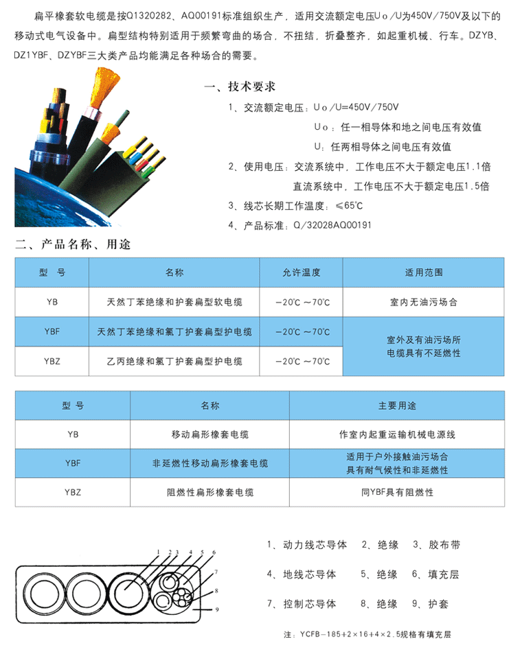 扁平橡套軟電纜是按Q1320282、AQ001-91標(biāo)準(zhǔn)組織生產(chǎn),適用交流額定電壓UO/U為450V/750V及以下的移動(dòng)式電氣設(shè)備中。扁型結(jié)構(gòu)特別適用于頻繁彎曲的場(chǎng)合,不扭結(jié),折疊整齊,如起重機(jī)械、行車。YB、YBF、YBZ三大類產(chǎn)品均能滿足各種場(chǎng)合的需要。