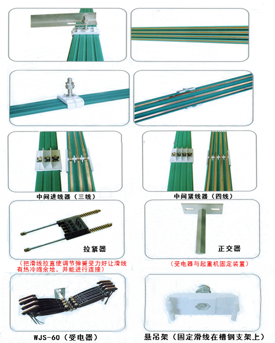 ※把一端滑線在 拉緊器固定牢固,把拉緊栓上好在拉緊架上,拉緊器放到大可調(diào)位置。根據(jù)所需長度切斷滑線安裝另一端拉緊器,然后調(diào)節(jié)彈簧緊松度。安裝時根據(jù)天氣調(diào)節(jié)彈簧緊松,冬天要壓緊彈簧,夏天要把彈簧壓平即可,這樣有利于滑線冷熱伸縮自然調(diào)節(jié)。(特別提醒拉緊器焊接一定要牢固)。