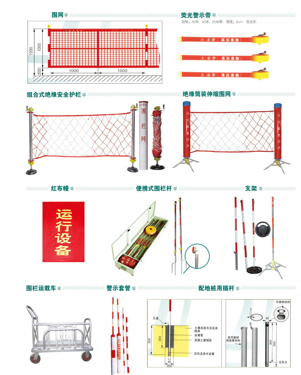 安全圍欄、安全遮攔、絕緣伸縮圍欄概述:裝設安全圍欄是保證現場工作人員的安全措施,主要用于發(fā)電廠,變電站的電氣設備檢修、電氣實驗、配電檢修等。常用的有不銹鋼帶式(錦綸),玻璃鋼片式的和圍網。支架分為墩式(法蘭盤),傘式,叉式,地樁。