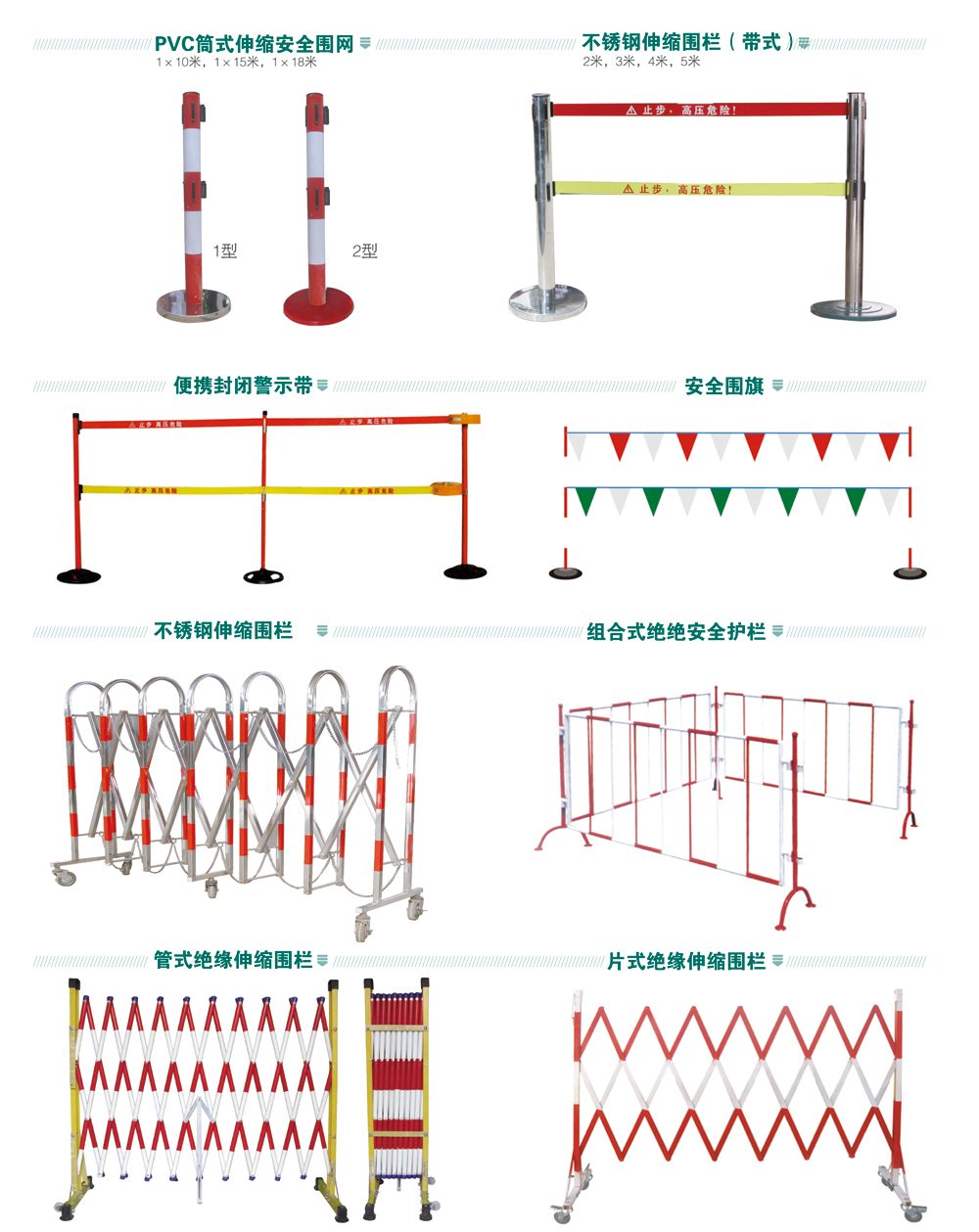 安全圍欄、安全遮攔、絕緣伸縮圍欄概述:裝設安全圍欄是保證現場工作人員的安全措施,主要用于發(fā)電廠,變電站的電氣設備檢修、電氣實驗、配電檢修等。常用的有不銹鋼帶式(錦綸),玻璃鋼片式的和圍網。