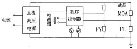 人工按一下檢測量鈕,便啟動直流壓電源,由程序控制器從FL上采樣,產(chǎn)生nmA的恒流通過試品,經(jīng)FY自動測量UnmA值,然后又由程序控制器發(fā)出指令產(chǎn)生0.5UnmA的恒定電壓加在試品上,進而從FL上測得流過MOA的電流Id。