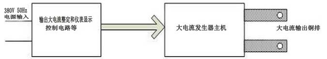 本產(chǎn)品輸入工作電源后,通過調(diào)整調(diào)壓器輸出低電壓以獲得試驗(yàn)所需的大電流。其工作原理圖如下: